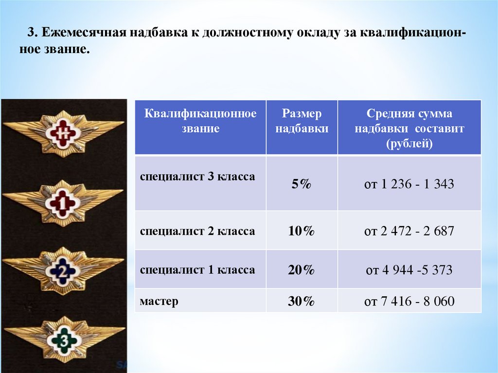 3. Ежемесячная надбавка к должностному окладу за квалификационное звание.Квалификационное