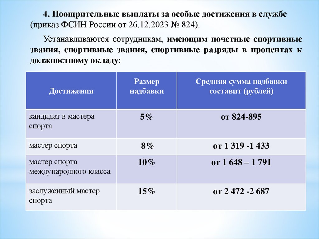 4. Поощрительные выплаты за особые достижения в службе(приказ ФСИН России от 26.12.2023 № 824).