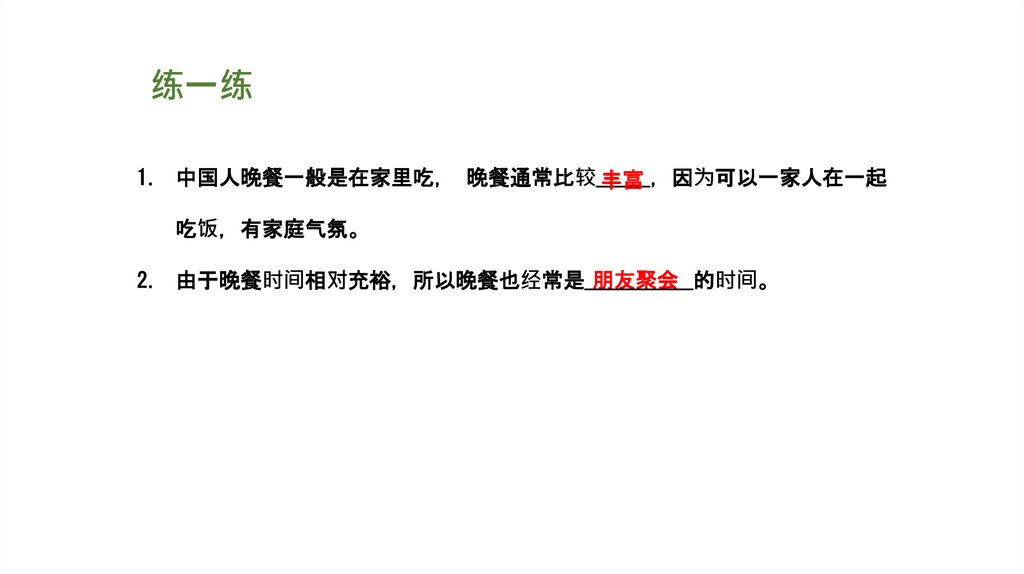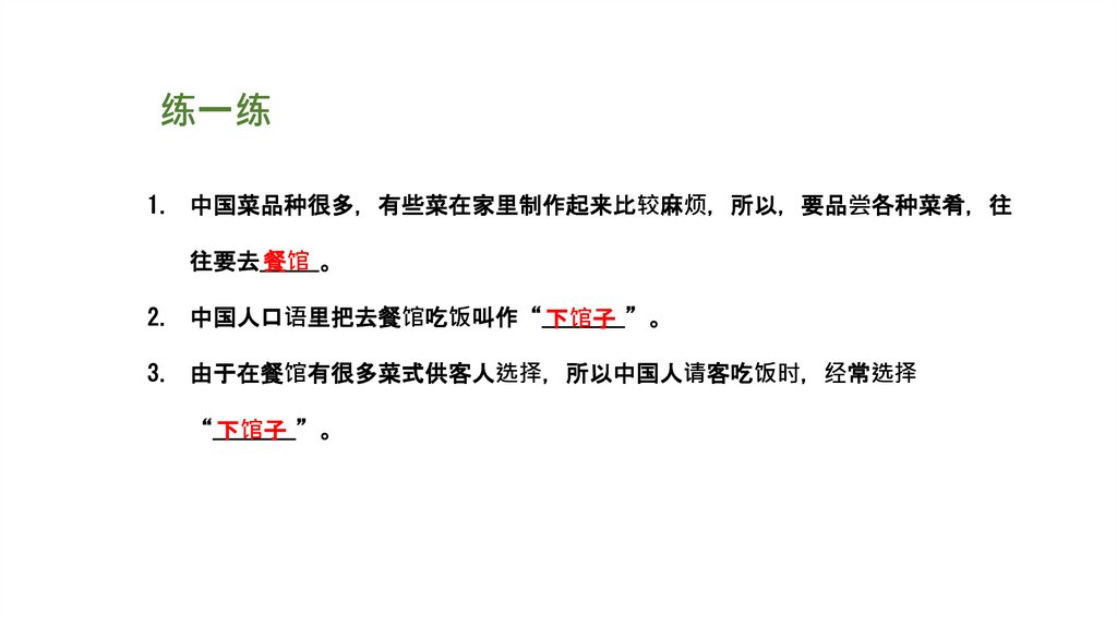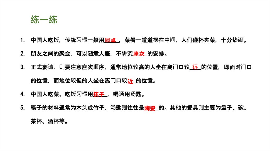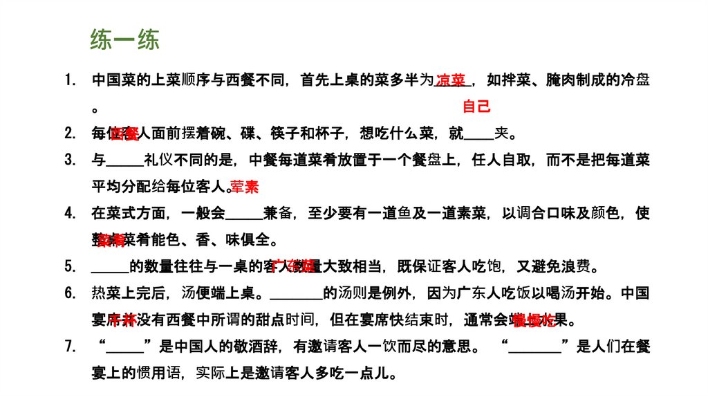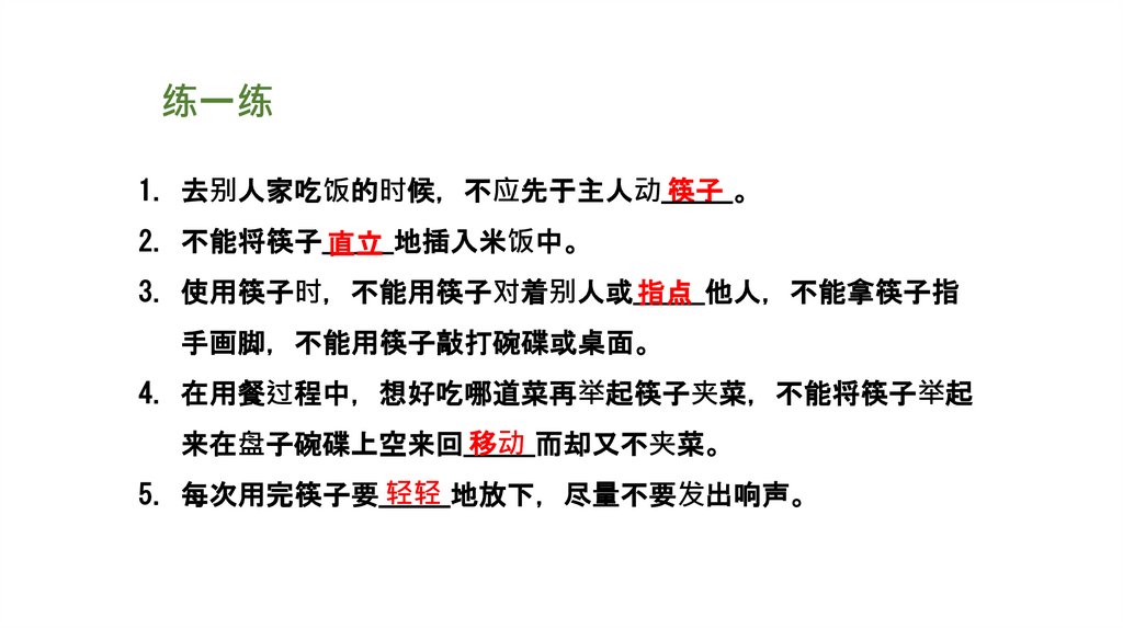 练一练1. 去别人家吃饭的时候 不应先于主人动_____。