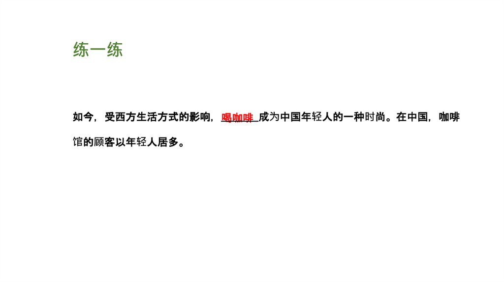 练一练如今 受西方生活方式的影响 _______成为中国年轻人的一种时尚。在中国 咖啡