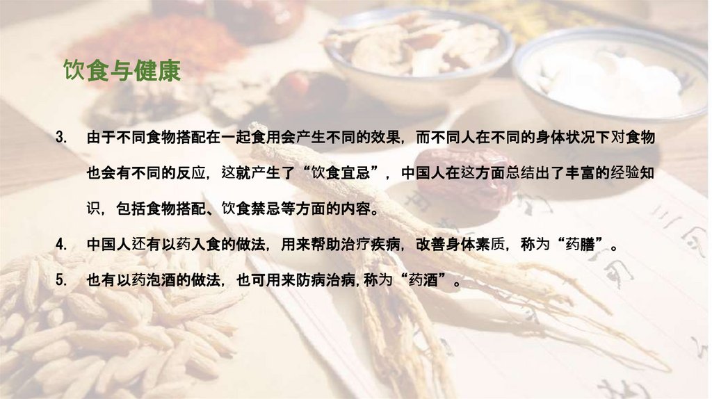 中国人还有以药入食的做法 用来帮助治疗疾病 改善身体素质 称为“药膳”。
