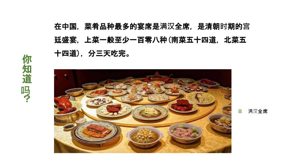 在中国 菜肴品种最多的宴席是________ 是清朝时期的宫