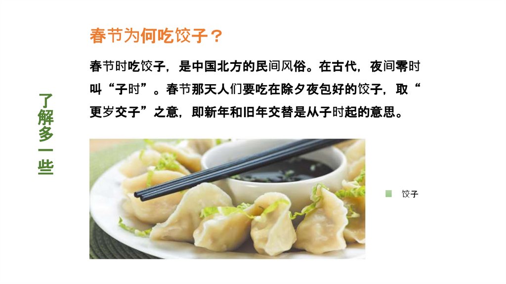 叫“子时”。春节那天人们要吃在除夕夜包好的饺子 取“