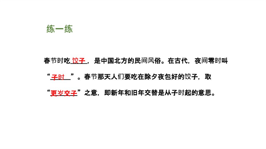 练一练春节时吃_____ 是中国北方的民间风俗。在古代 夜间零时叫