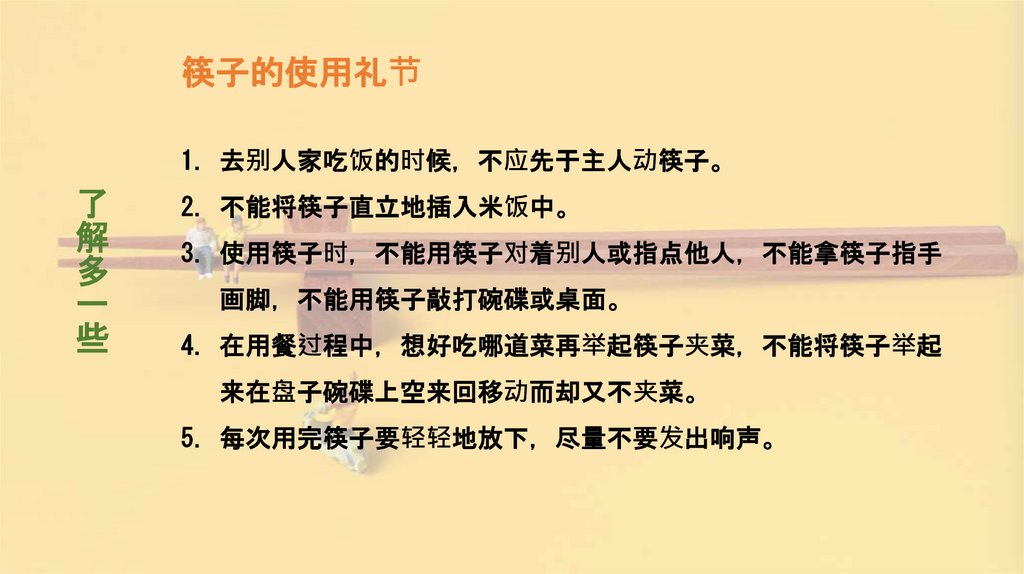 5. 每次用完筷子要轻轻地放下 尽量不要发出响声。