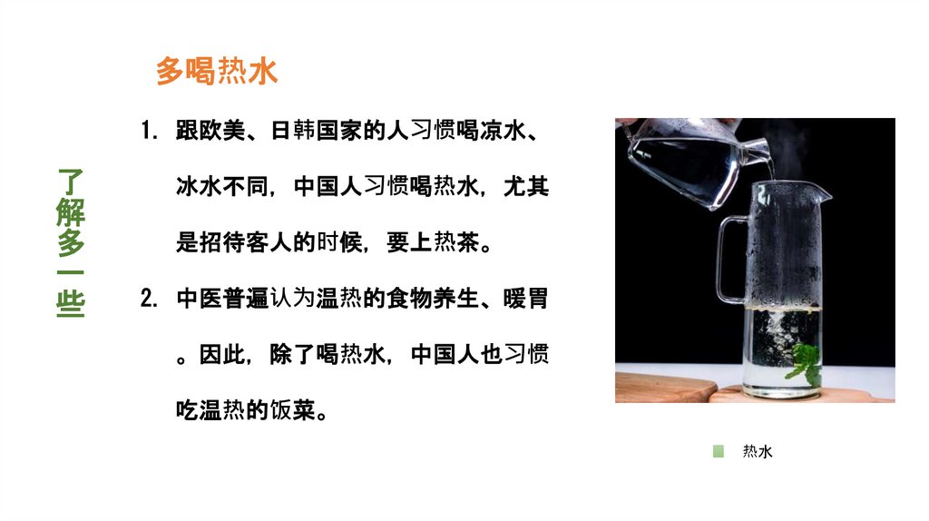 多喝热水1. 跟欧美、日韩国家的人习惯喝凉水、