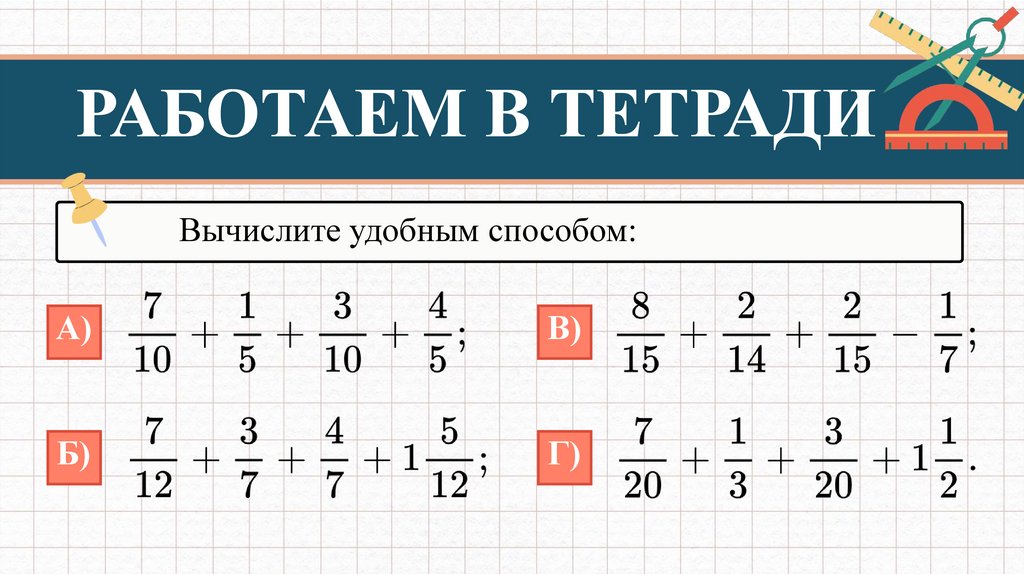 РАБОТАЕМ В ТЕТРАДИВычислите удобным способом: