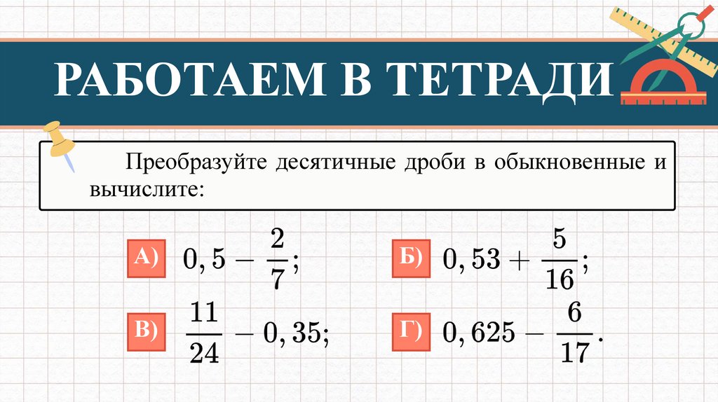 РАБОТАЕМ В ТЕТРАДИПреобразуйте десятичные дроби в обыкновенные и