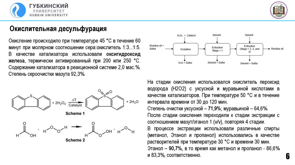 Окислительная десульфурацияОкисление происходило при температуре 45 °C в течение 60
