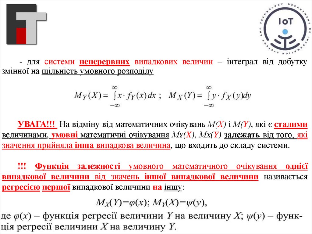 - для системи неперервних випадкових величин – інтеграл від добуткузмінної на щільність умовного розподілу