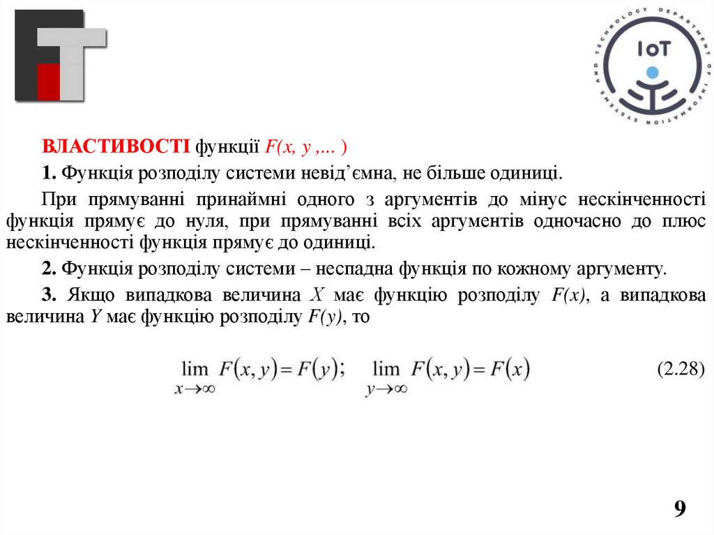 ВЛАСТИВОСТІ функції F(x, y ,... )1. Функція розподілу системи невід’ємна, не більше одиниці.