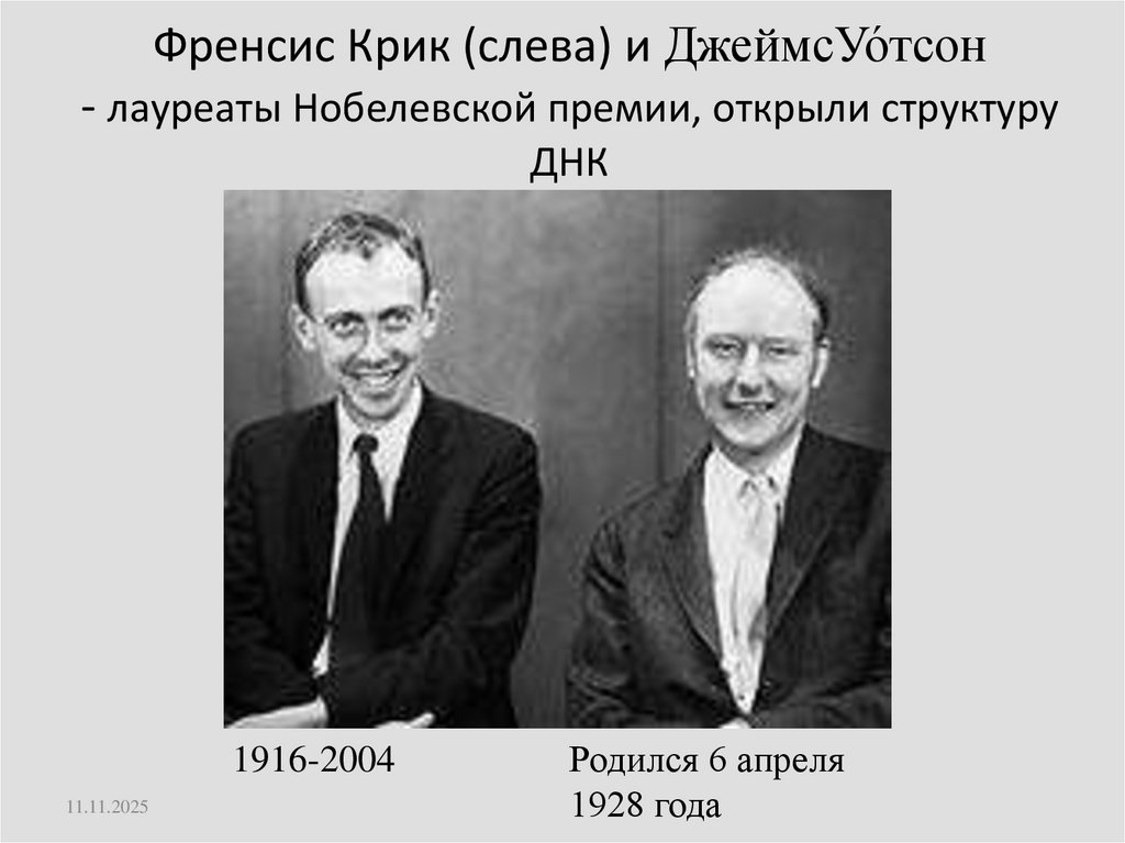 Френсис Крик (слева) и ДжеймсУо́тсон- лауреаты Нобелевской премии, открыли структуру
