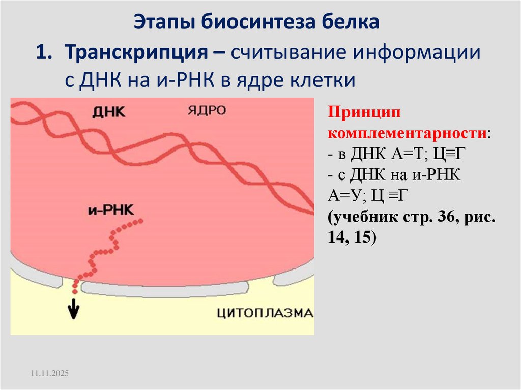 Этапы биосинтеза белка1. Транскрипция – считывание информации