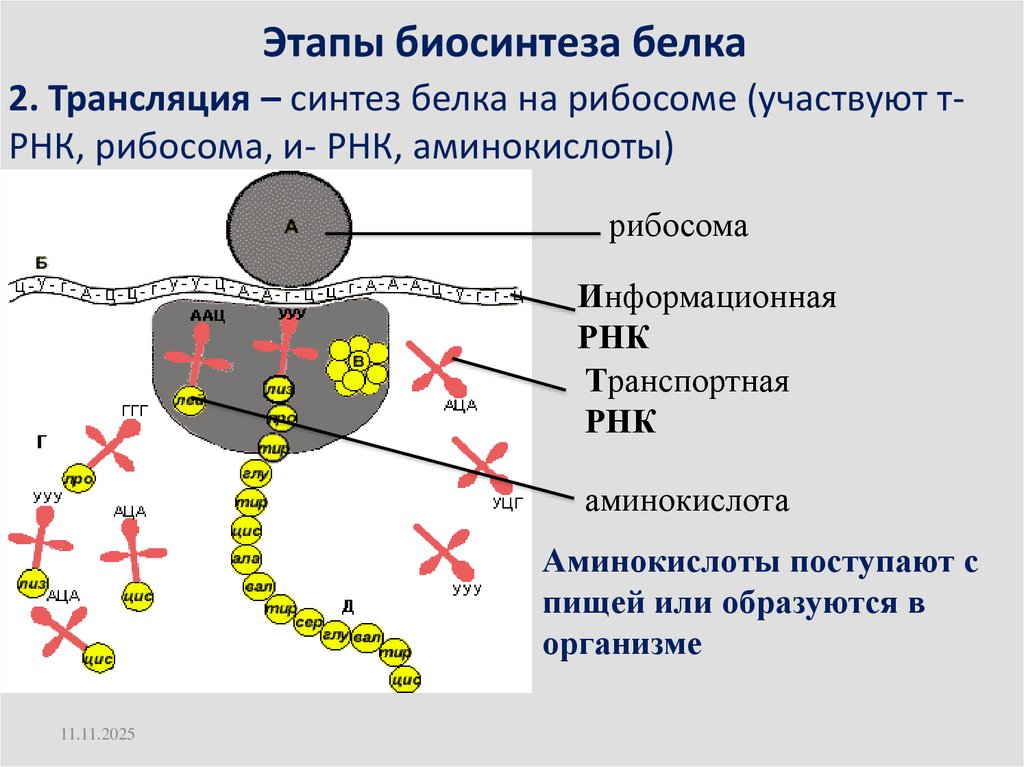 Этапы биосинтеза белка2. Трансляция – синтез белка на рибосоме (участвуют тРНК, рибосома, и- РНК, аминокислоты)
