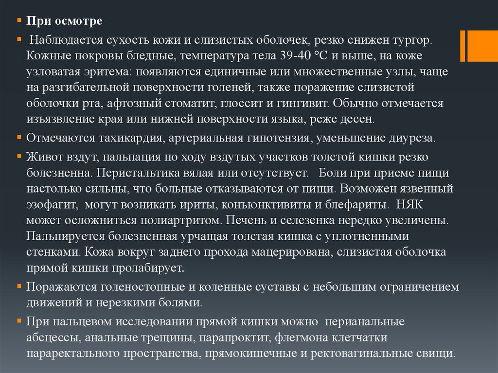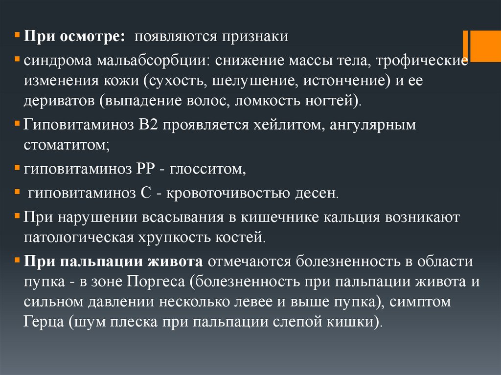 При осмотре: появляются признакисиндрома мальабсорбции: снижение массы тела, трофические