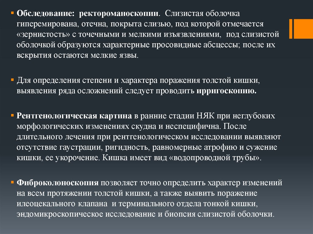 Обследование: ректороманоскопии. Слизистая оболочкагиперемирована, отечна, покрыта слизью, под которой отмечается