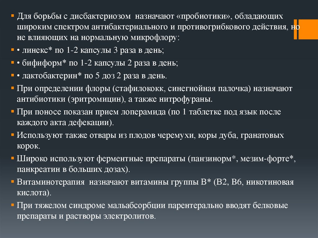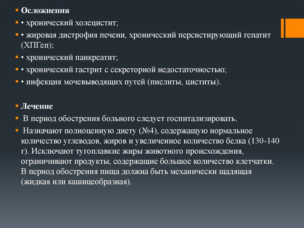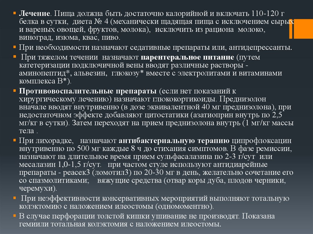 Лечение. Пища должна быть достаточно калорийной и включать 110-120 гбелка в сутки, диета № 4 (механически щадящая пища с исключением сырых