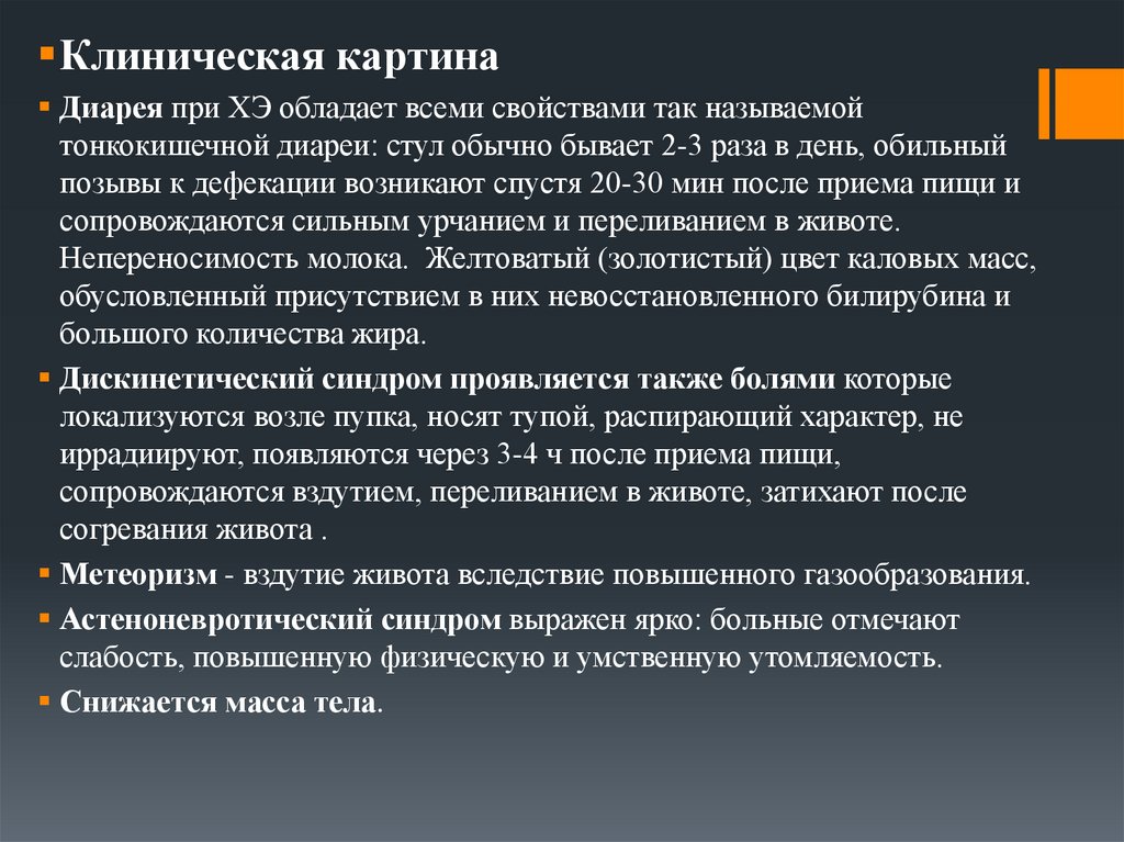 Клиническая картинаДиарея при ХЭ обладает всеми свойствами так называемой