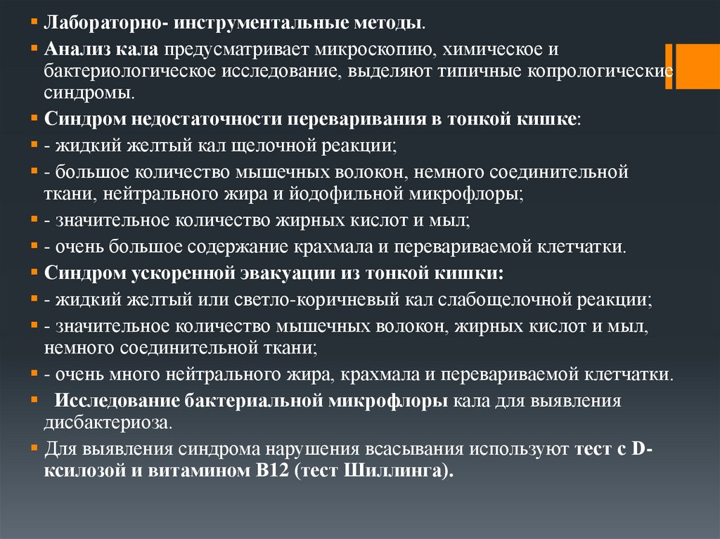 Лабораторно- инструментальные методы.Анализ кала предусматривает микроскопию, химическое и