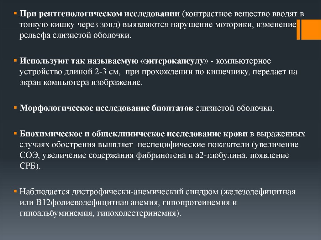 При рентгенологическом исследовании (контрастное вещество вводят втонкую кишку через зонд) выявляются нарушение моторики, изменение