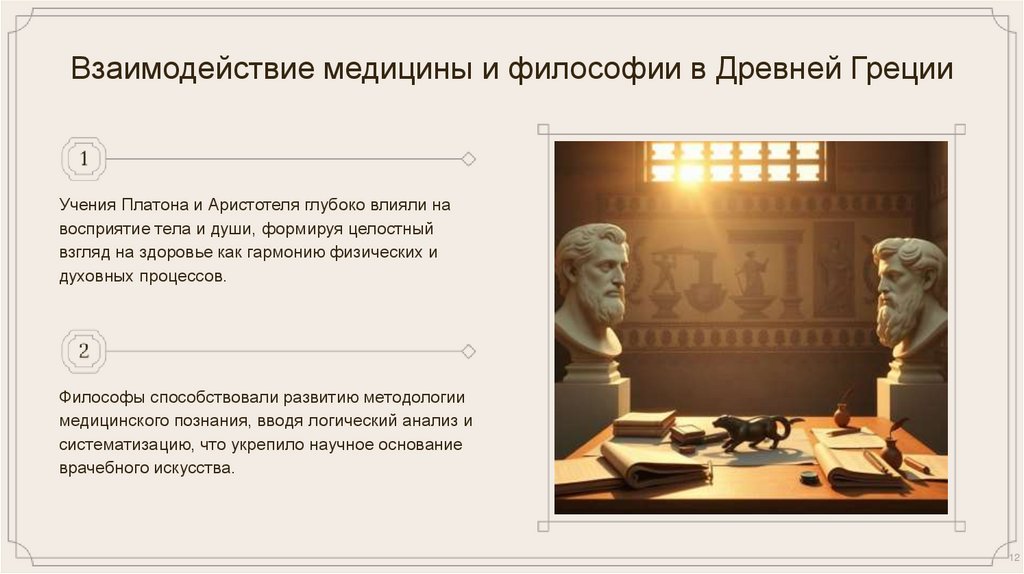 Взаимодействие медицины и философии в Древней ГрецииУчения Платона и Аристотеля глубоко влияли на