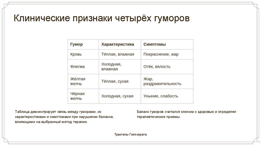 Клинические признаки четырёх гуморовТаблица демонстрирует связь между гуморами, их