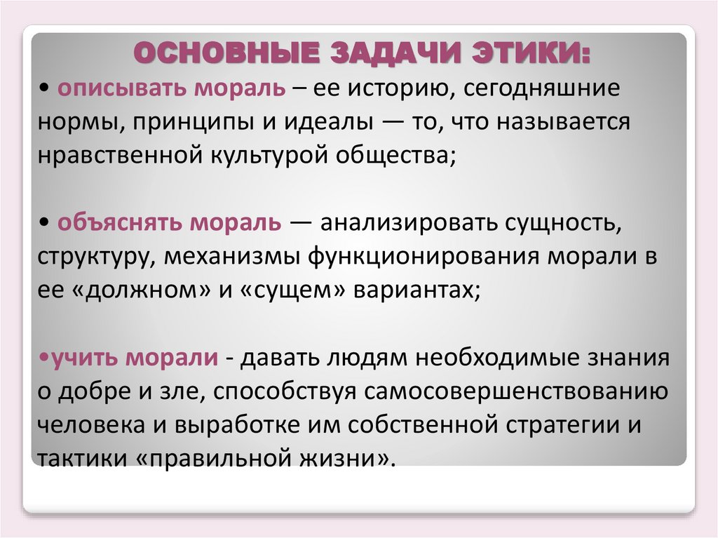 ОСНОВНЫЕ ЗАДАЧИ ЭТИКИ:• описывать мораль – ее историю, сегодняшние
