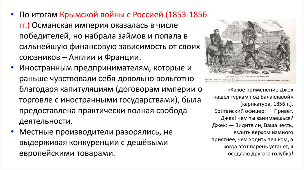 • По итогам Крымской войны с Россией (1853-1856гг.) Османская империя оказалась в числе