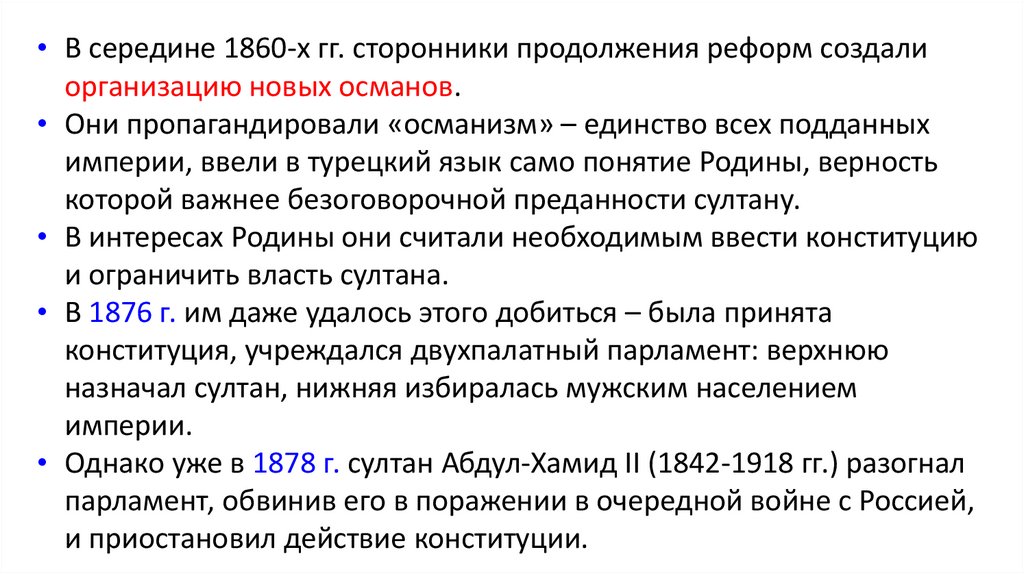 • Однако уже в 1878 г. султан Абдул-Хамид II (1842-1918 гг.) разогнал