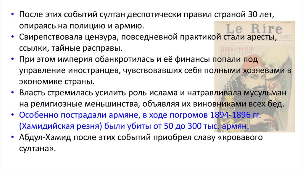 • Абдул-Хамид после этих событий приобрел славу «кровавого