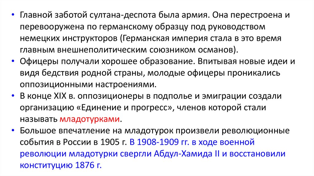 • Главной заботой султана-деспота была армия. Она перестроена иперевооружена по германскому образцу под руководством
