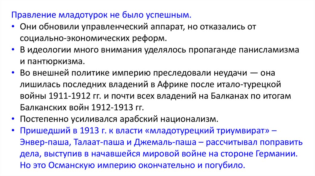 Правление младотурок не было успешным.• Они обновили управленческий аппарат, но отказались от