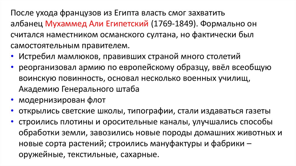 После ухода французов из Египта власть смог захватитьалбанец Мухаммед Али Египетский (1769-1849). Формально он
