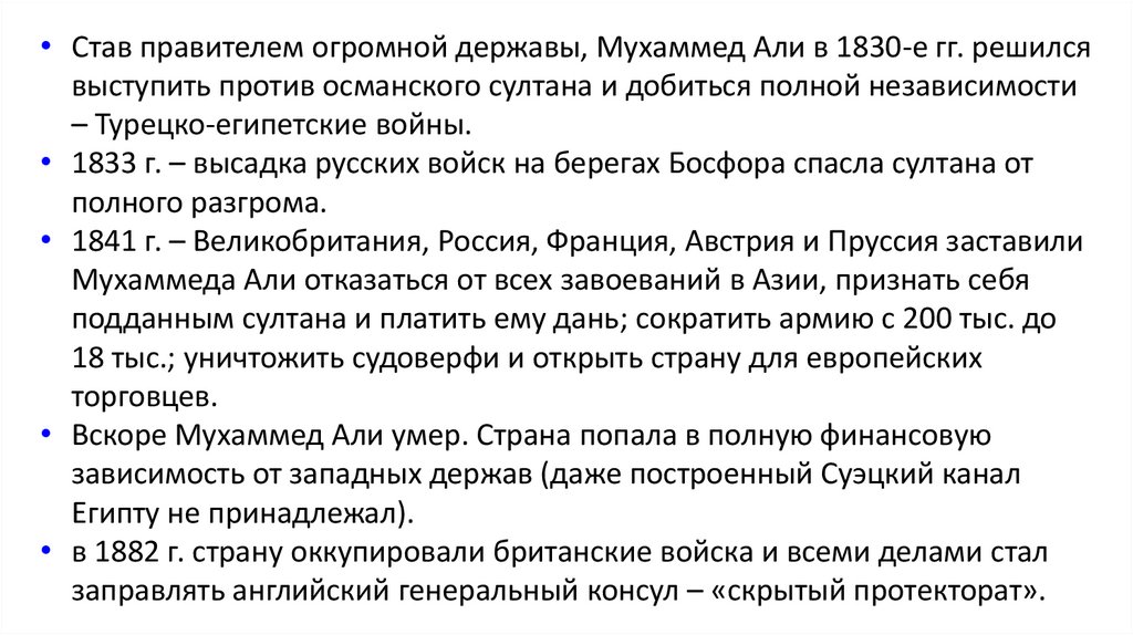 • Вскоре Мухаммед Али умер. Страна попала в полную финансовую