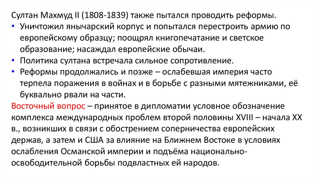 Султан Махмуд II (1808-1839) также пытался проводить реформы.• Уничтожил янычарский корпус и попытался перестроить армию по
