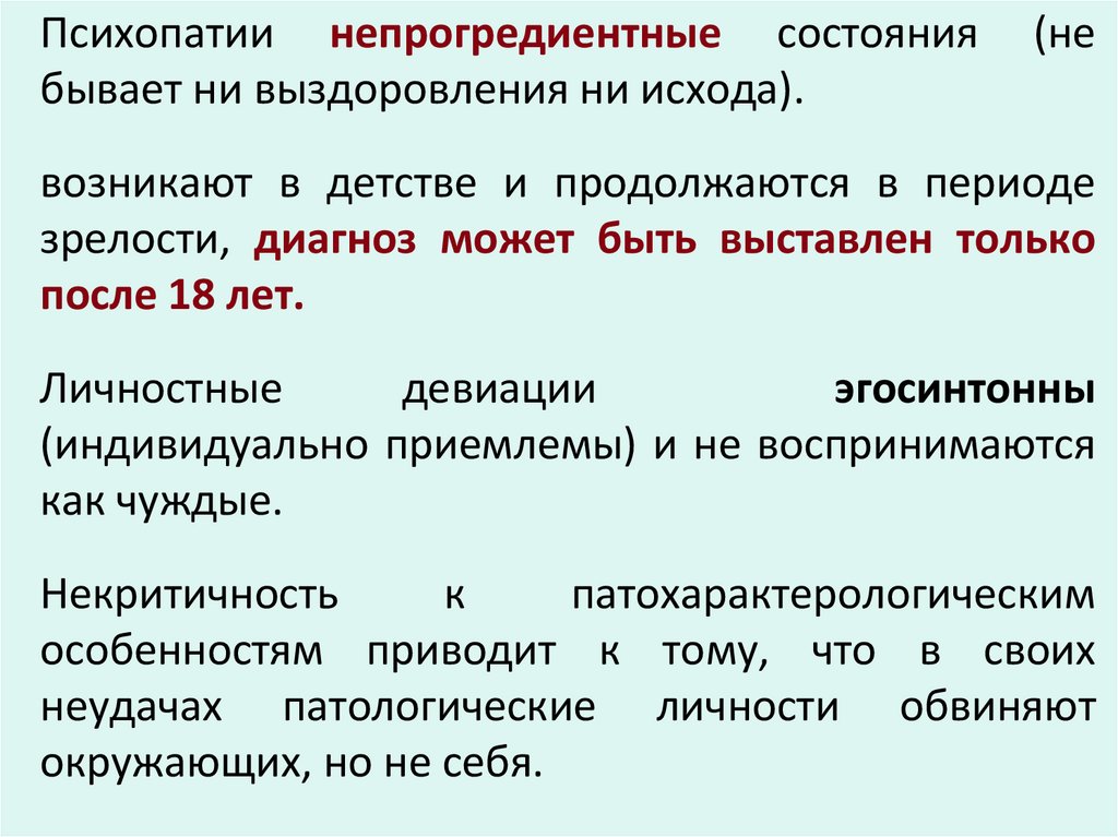 Психопатии непрогредиентные состояниябывает ни выздоровления ни исхода).