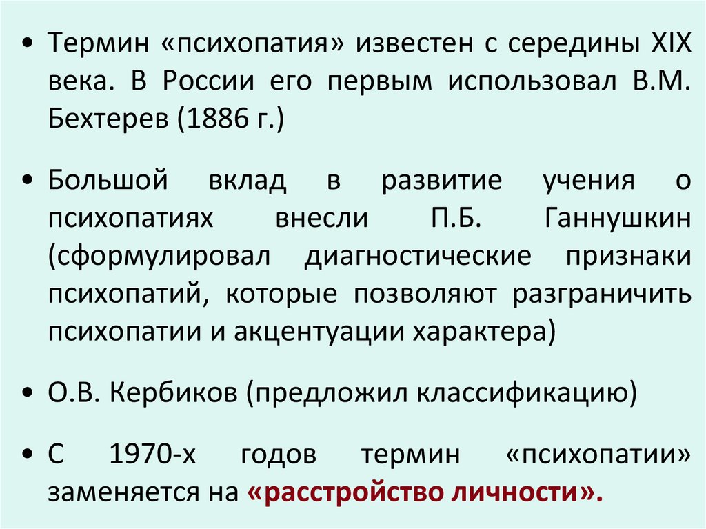 • Термин «психопатия» известен с середины XIXвека. В России его первым использовал В.М.