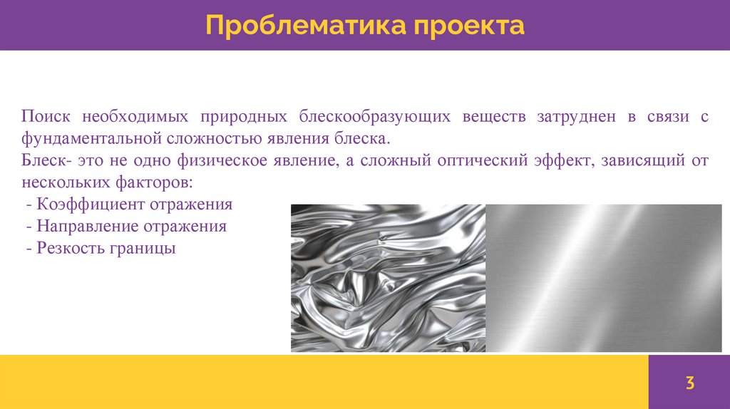 Проблематика проектаПоиск необходимых природных блескообразующих веществ затруднен в связи с