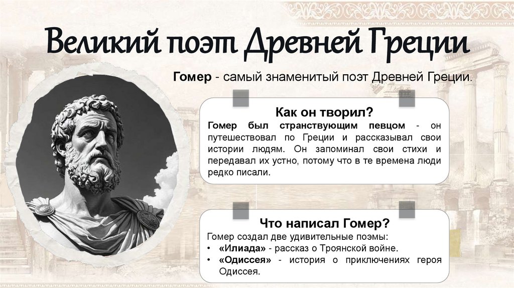 Великий поэт Древней ГрецииГомер - самый знаменитый поэт Древней Греции.