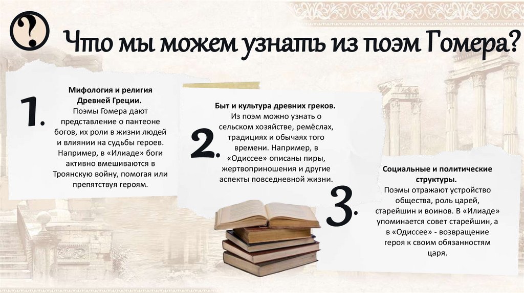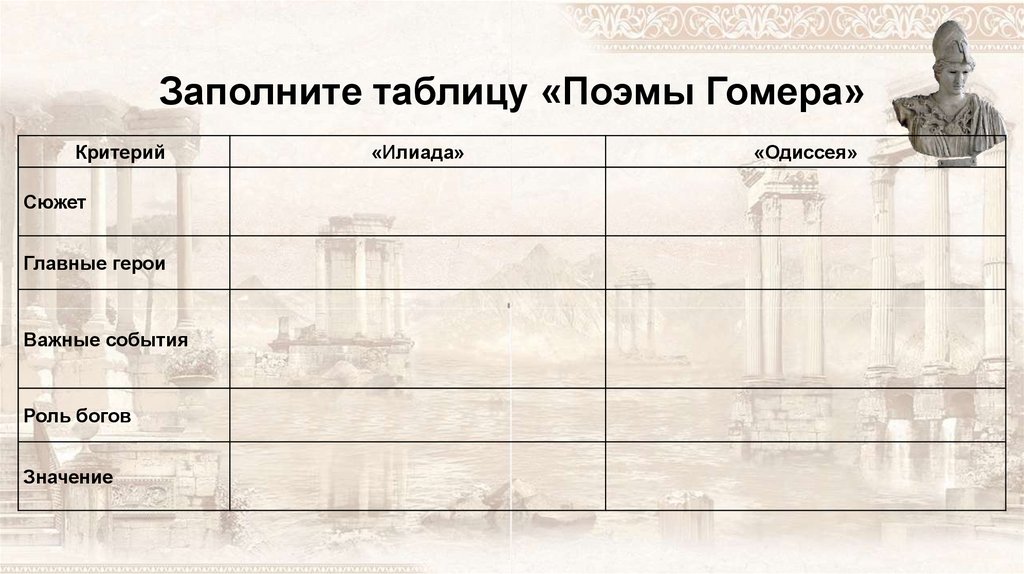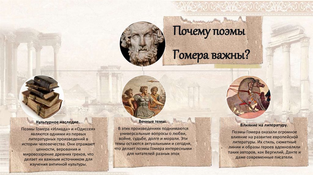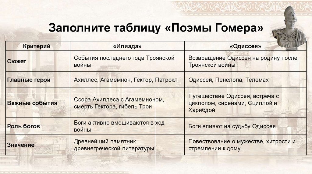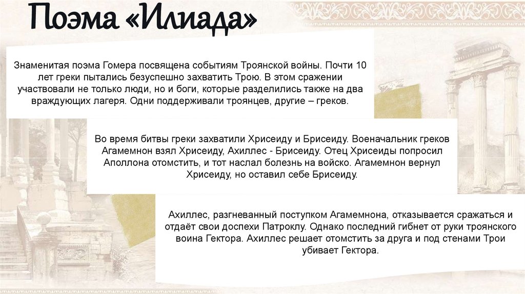 Поэма «Илиада»Знаменитая поэма Гомера посвящена событиям Троянской войны. Почти 10