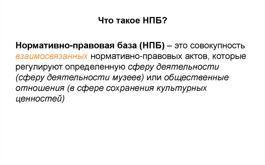 Нормативно-правовая база (НПБ) – это совокупностьвзаимосвязанных нормативно-правовых актов, которые