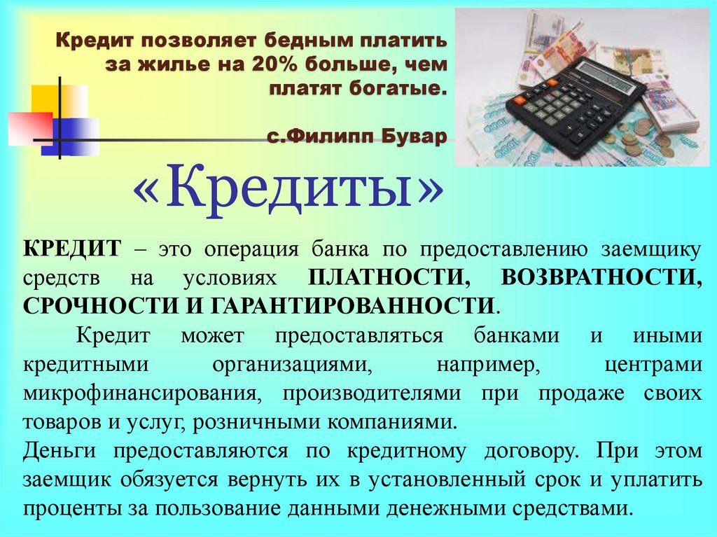 1. Кредит позволяет бедным платить за жилье на 20% больше, чем платят богатые. с.Филипп Бувар «Кредиты»