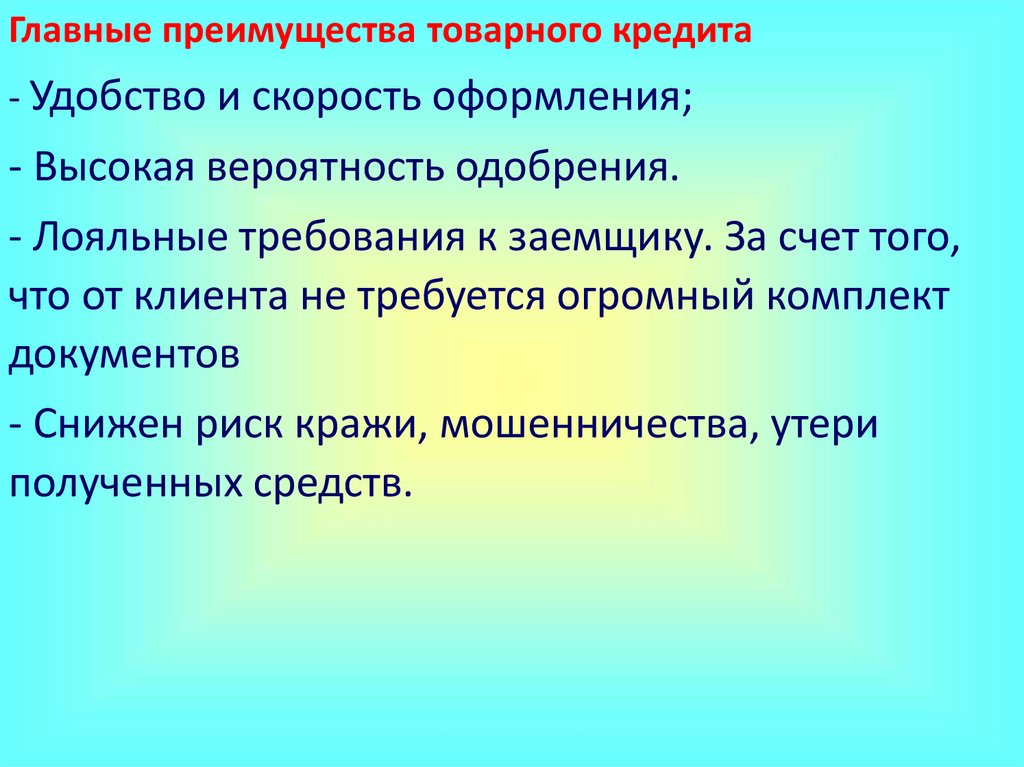 Главные преимущества товарного кредита- Удобство и скорость оформления;