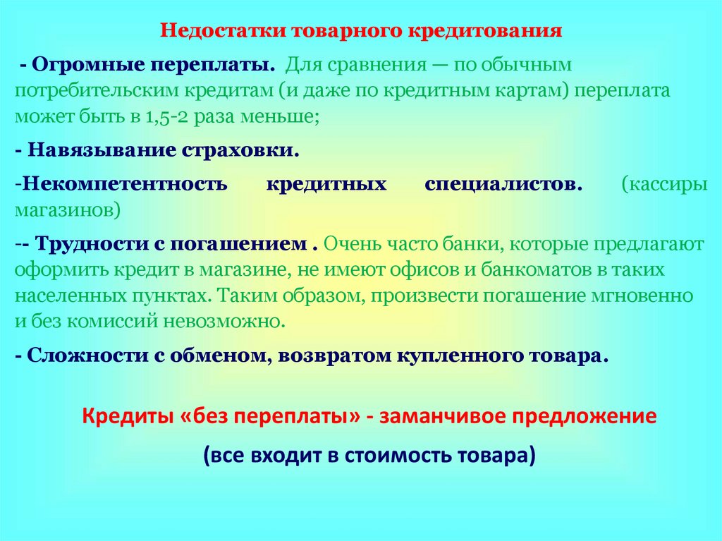 Недостатки товарного кредитования- Огромные переплаты. Для сравнения — по обычным