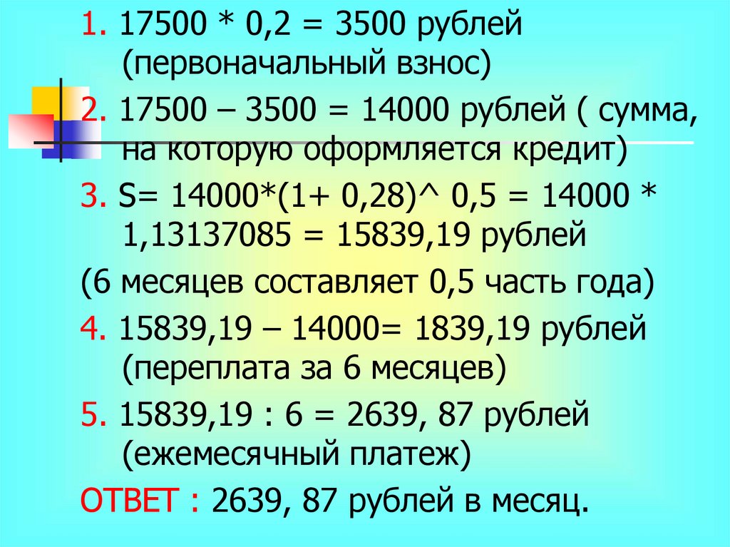 1. 17500 * 0,2 = 3500 рублей(первоначальный взнос)