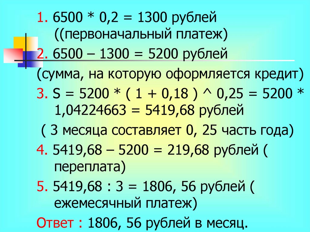 1. 6500 * 0,2 = 1300 рублей((первоначальный платеж)