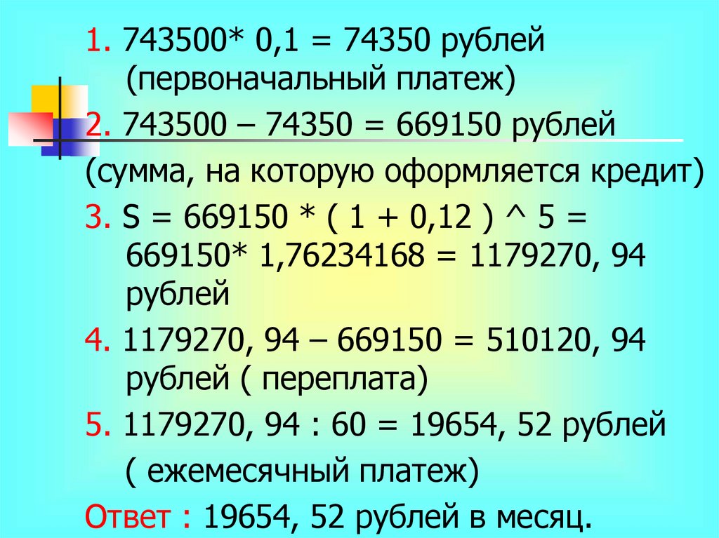 1. 743500* 0,1 = 74350 рублей(первоначальный платеж)