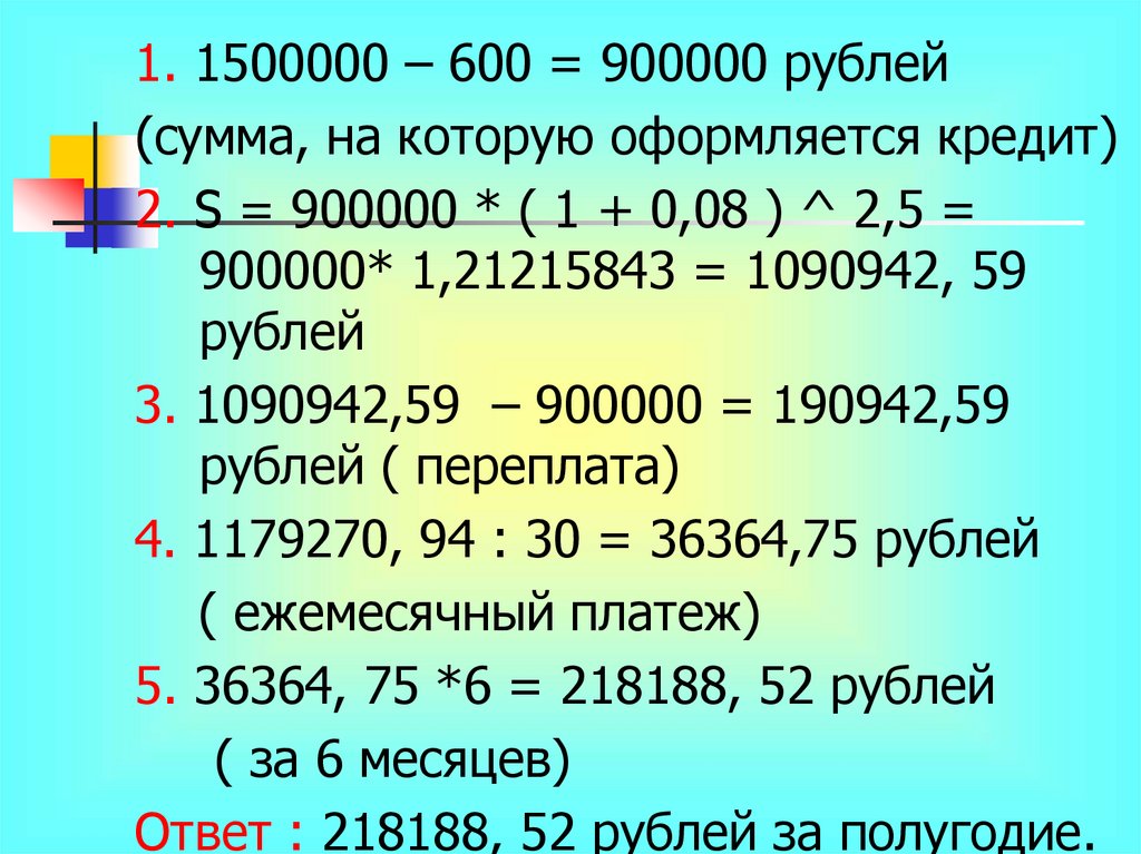 1. 1500000 – 600 = 900000 рублей(сумма, на которую оформляется кредит)