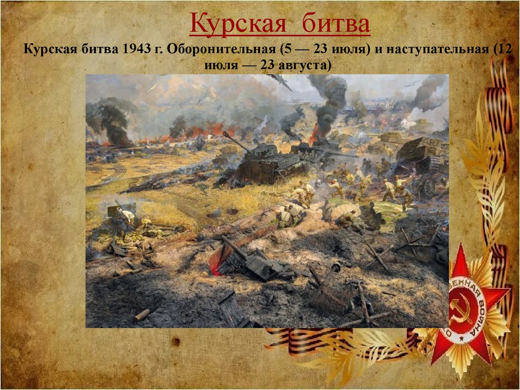 Курская битваКурская битва 1943 г. Оборонительная (5 — 23 июля) и наступательная (12