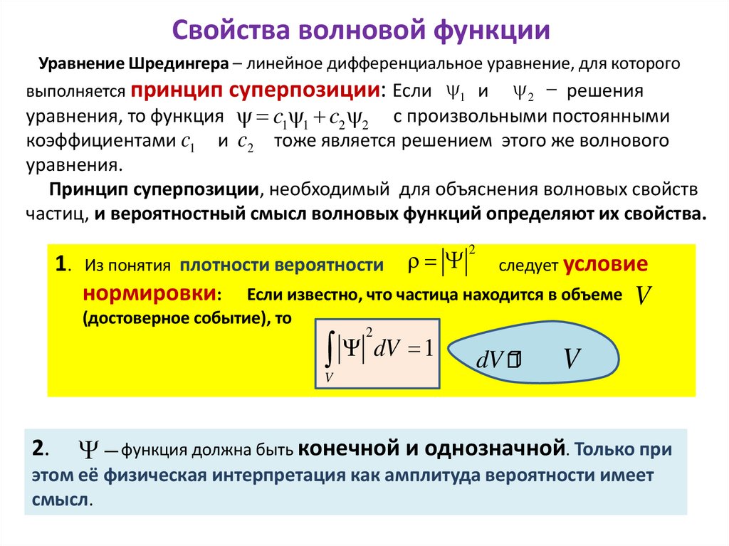 Свойства волновой функцииУравнение Шредингера – линейное дифференциальное уравнение, для которого